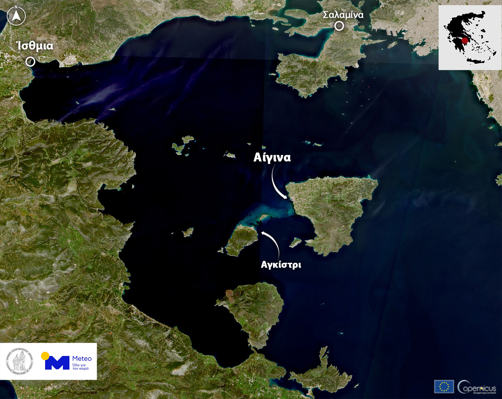 Η παρακάτω δορυφορική εικόνα εστιάζει στον Σαρωνικό Κόλπο, όπου διακρίνονται διαφορετικοί χρωματισμοί στην επιφάνεια της θάλασσας. Πιο συγκεκριμένα, παρατηρούμε το ανοιχτό μπλε ανάμεσα στην Αίγινα και το Αγκίστρι, το οποίο οφείλεται στα ρηχά και καθαρά νερά πάνω από τον αμμώδη βυθό της εν λόγω περιοχής. Αντίθετα, τα πιο σκούρα χρώματα στα βορειοδυτικά του κόλπου δεν οφείλονται στο νερό, αλλά σε σωματίδια σκόνης και φερτά υλικά από τις παραθαλάσσιες περιοχές της Κορινθίας (Άγιοι Θεόδωροι βορειοανατολικά και Κατακάλι, Πευκάλι στα νοτιοανατολικά).