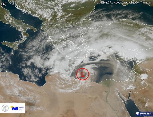 Στη δορυφορική εικόνα της Παρασκευής 17 Απριλίου 2026 από την ευρύτερη περιοχή της Ανατολικής Μεσοογείου καταγράφεται ένα βαρομετρικό χαμηλό (L) στα νοτιοανατολικά της Κρήτης, με τη χαρακτηριστική κυκλωνική δομή των νεφών γύρω από το κέντρο του συστήματος. Η κυκλοφορία του συστήματος ευνόησε τη μεταφορά αερίων μαζών από τις ακτές της Βόρειας Αφρικής προς την Κρήτη και γενικότερα προς την ανατολική Ελλάδα, μεταφέροντας σημαντικές ποσότητες αφρικανικής σκόνης, που είχαν ως αποτέλεσμα τη δημιουργία της θολής ατμόσφαιρας και της λασποβροχής που επικράτησε σε πολλά τμήματα της χώρας.