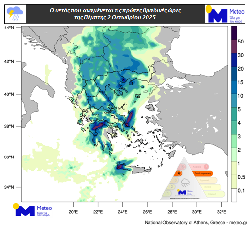 Πιο αναλυτικά, από το βράδυ της Τετάρτης 01/10 βροχές και καταιγίδες αναμένονται στο Ιόνιο. Από τις πρώτες ώρες της Πέμπτης 02/10 τα φαινόμενα θα επεκταθούν και στα ηπειρωτικά, με εξαίρεση την Ανατολική Μακεδονία και Θράκη. Η Ανατολική Μακεδονία και Θράκη, το Βόρειο Αιγαίο, οι Κυκλάδες και η Κρήτη αναμένεται να επηρεαστούν από το μεσημέρι της Πέμπτης 02/10. Τα φαινόμενα θα είναι κατά τόπους ισχυρά στο Ιόνιο και στα δυτικά ηπειρωτικά έως το απόγευμα της Πέμπτης 02/10, στην Πελοπόννησο από τις πρώτες ώρες έως και τις βραδινές ώρες της Πέμπτης 02/10 και στην Ανατολική Στερεά, σε τμήματα της Κεντρικής και Ανατολικής Μακεδονίας, στο Βόρειο Αιγαίο και στην Κρήτη από το απόγευμα της Πέμπτης 02/10. Στους χάρτες που ακολουθούν παρουσιάζεται ο υετός που αναμένεται (1) τις πρώτες ώρες, (2) το πρωί και (3) τις πρώτες βραδινές ώρες της Πέμπτης 02/10.