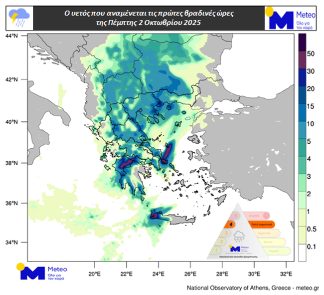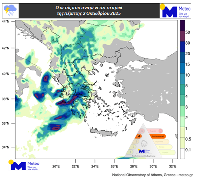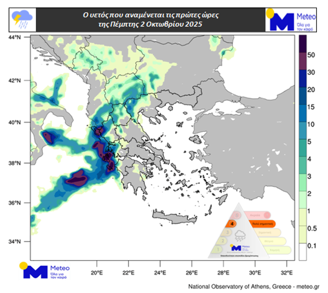 Βαρομετρικό χαμηλό που προσεγγίζει τη χώρα μας από τα δυτικά θα προκαλέσει ισχυρή κακοκαιρία κατά το διήμερο Πέμπτης 02/10 – Παρασκευής 03/10. Σύμφωνα με τα τελευταία προγνωστικά δεδομένα του meteo.gr / Εθνικού Αστεροσκοπείου Αθηνών, τα κυριότερα χαρακτηριστικά της θα είναι: