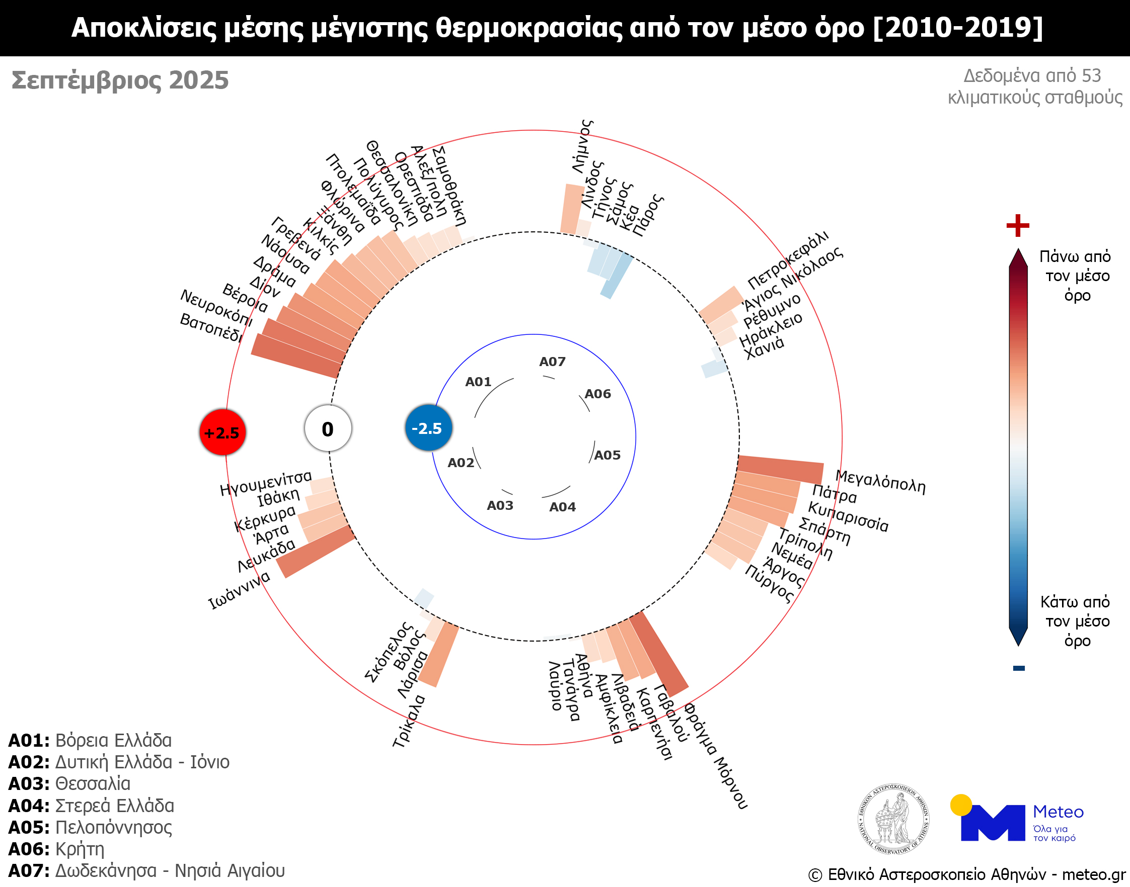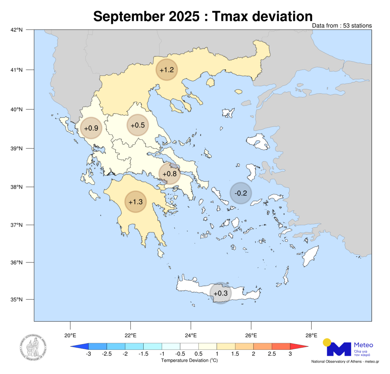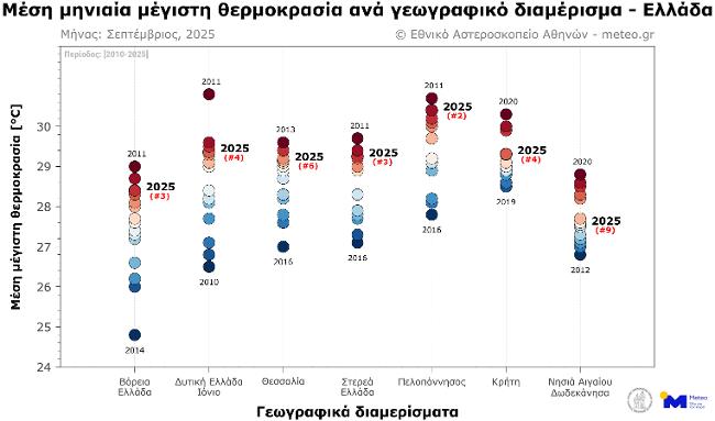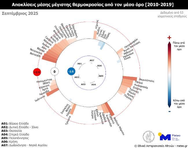 Σύμφωνα με το δίκτυο των 53 μετεωρολογικών σταθμών του meteo.gr του Εθνικού Αστεροσκοπείου Αθηνών (Ε.Α.Α.), που λειτουργούν ανελλιπώς από το 2010 έως σήμερα, τον Σεπτέμβριο του 2025 η μέση τιμή των μεγίστων ημερήσιων θερμοκρασιών κυμάνθηκε σε υψηλότερα για την εποχή επίπεδα σε όλα τα γεωγραφικά διαμερίσματα, εκτός από τα Νησιά του Αιγαίου, όπου καταγράφηκε ελαφρώς χαμηλότερη από τα κανονικά τιμή (σε σύγκριση με τον μέσο όρο της περιόδου 2010–2019).
