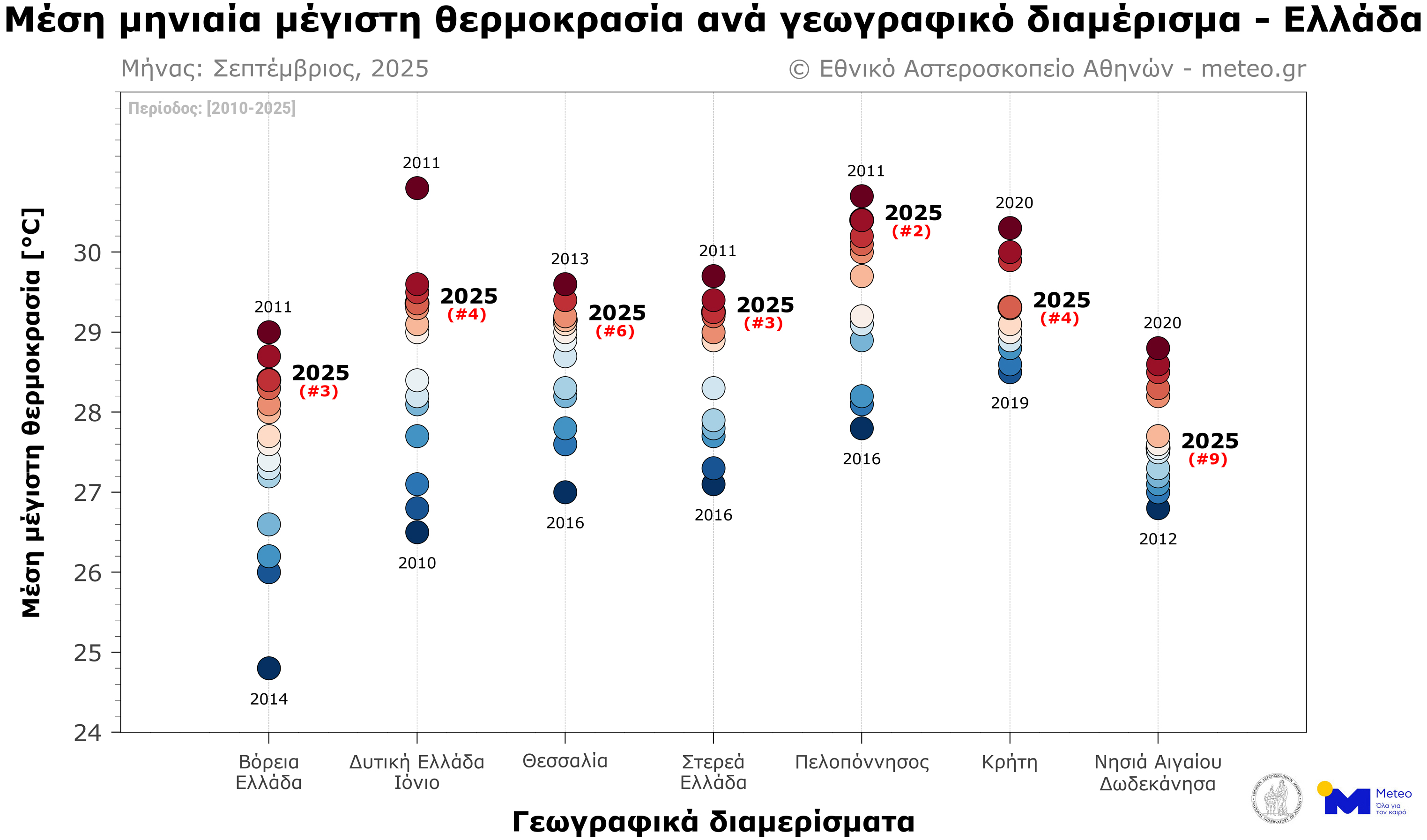 Το επόμενο γράφημα παρουσιάζει την κατάταξη του Σεπτεμβρίου ανά έτος, με βάση τη μέση μηνιαία τιμή της μέγιστης θερμοκρασίας. Στην Πελοπόννησο καταγράφηκε ως ο 2ος θερμότερος από το 2010, στη Βόρεια και Στερεά Ελλάδα ο Σεπτέμβριος του 2025 ήταν ο 3ος θερμότερος, στη Δυτική Ελλάδα - Ιόνιο και την Κρήτη καταγράφηκε ως ο 4ος θερμότερος, και τέλος στη Θεσσαλία και στα Νησιά Αιγαίου & Δωδεκάνησα ως ο 6ος και ο 9ος θερμότερος αντίστοιχα από το 2010.