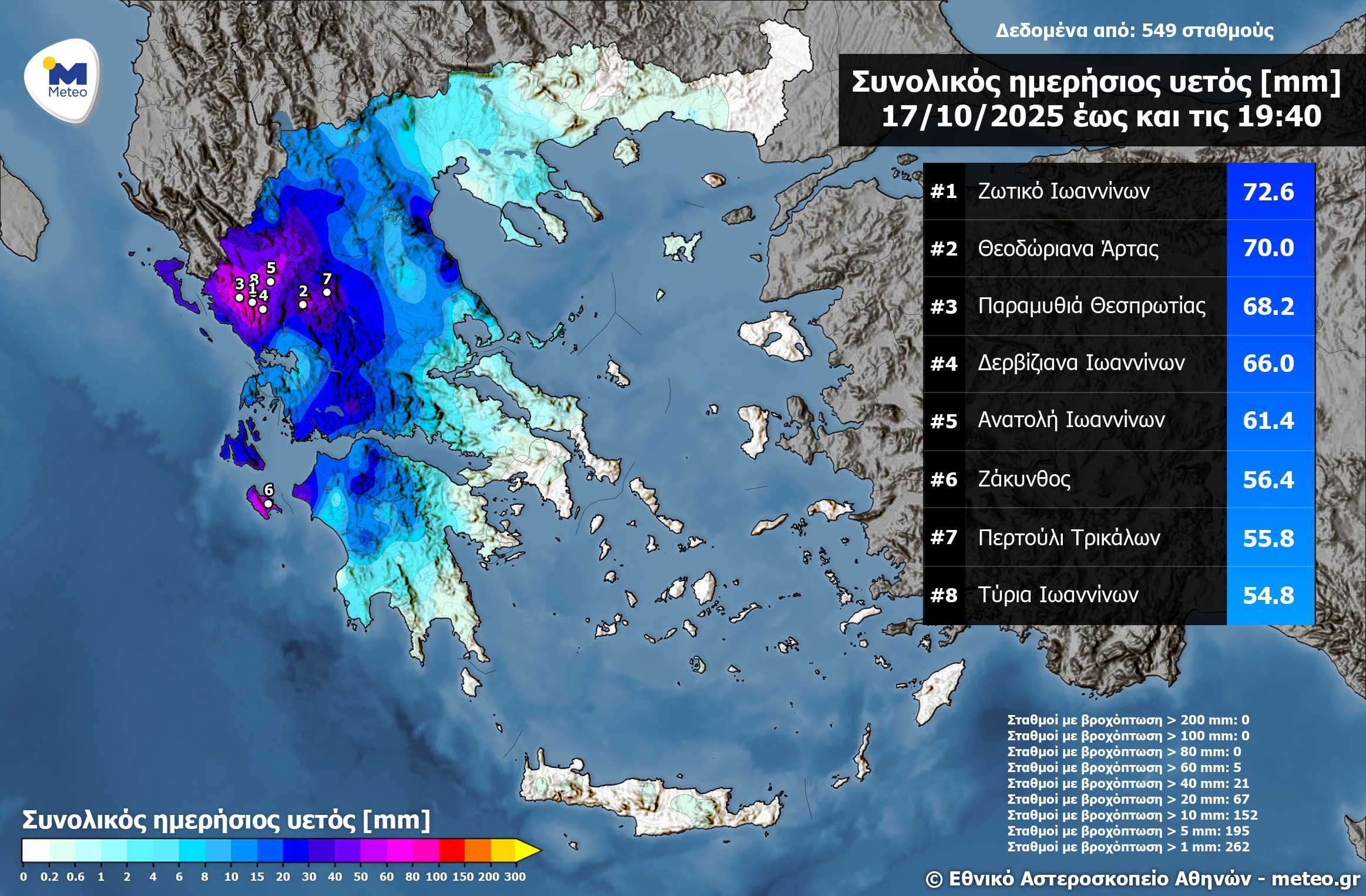 Στα δυτικά και κυρίως σε τμήματα της βορειοδυτικής ηπειρωτικής χώρας εντοπίζονται οι σημαντικότερες βροχοπτώσεις της Παρασκευής 17/10 έως τις 19:40 το απόγευμα. Στον χάρτη της εικόνας που ακολουθεί παρουσιάζεται η κατανομή του αθροιστικού υετού έως τις 19:40, σύμφωνα με το δίκτυο αυτόματων μετεωρολογικών σταθμών του meteo.gr / Εθνικού Αστεροσκοπείου Αθηνών, καθώς και οι 8 σταθμοί του δικτύου που κατέγραψαν τα μεγαλύτερα ύψη. Το μεγαλύτερο ύψος βροχής στη χώρα έχει καταγραφεί στο Ζωτικό Ιωαννίνων και είναι ίσο με 72,6 χιλιοστά.