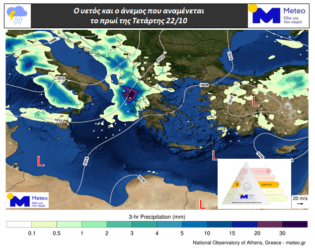 Σύμφωνα με την κατηγοριοποίηση των επεισοδίων βροχόπτωσης (Regional Precipitation Index), η οποία εφαρμόζεται από τη μονάδα Meteo του Εθνικού Αστεροσκοπείου Αθηνών, το επεισόδιο βροχόπτωσης για την Τετάρτη 22/10 κατατάσσεται στην Κατηγορία 3 (Σημαντική).