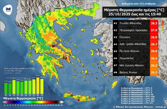 Στην Ανατολική Στερεά και στην Κρήτη καταγράφηκαν οι υψηλότερες θερμοκρασίες του Σαββάτου 25/10, σύμφωνα με το δίκτυο αυτόματων μετεωρολογικών σταθμών του meteo.gr / Εθνικού Αστεροσκοπείου Αθηνών. Η μέγιστη καταγράφηκε στη Στυλίδα Φθιώτιδας και ήταν ίση με 28.3 °C. Στον χάρτη της εικόνας που ακολουθεί παρουσιάζεται η κατανομή της μέγιστης θερμοκρασίας στη χώρα καθώς και οι 8 σταθμοί με τις υψηλότερες μέγιστες. Όπως προκύπτει από τις υπόλοιπες πληροφορίες που παρουσιάζονται στην εικόνα αυτή, η μέση μέγιστη θερμοκρασία (22.1 °C) ήταν κατά 1.6 °C χαμηλότερη αυτής της Παρασκευής 24/10 (23.7°C).
