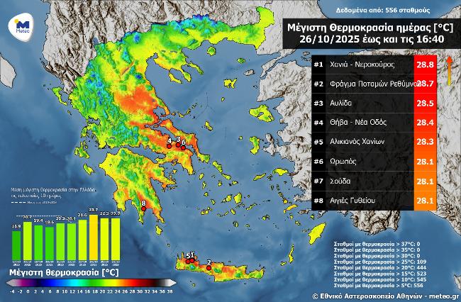 Πλησίασε τους 29 °C η θερμοκρασία το μεσημέρι της Κυριακής 26/10. Πιο συγκεκριμένα, ο μετεωρολογικός σταθμός Νεροκούρου Χανίων κατέγραψε θερμοκρασία 28.8 °C. Στον χάρτη της εικόνας που ακολουθεί παρουσιάζεται η κατανομή της μέγιστης θερμοκρασίας μεταξύ των σταθμών του δικτύου του meteo.gr / Εθνικού Αστεροσκοπείου Αθηνών καθώς οι 8 σταθμοί με τις υψηλότερες μέγιστες. Όπως προκύπτει από τις επιπλέον πληροφορίες που παρουσιάζονται στην εικόνα, η μέγιστη θερμοκρασία ξεπέρασε τους 25 °C σε 109 από τους 556 ενεργούς σταθμούς του δικτύου (ποσοστό ~ 20%).