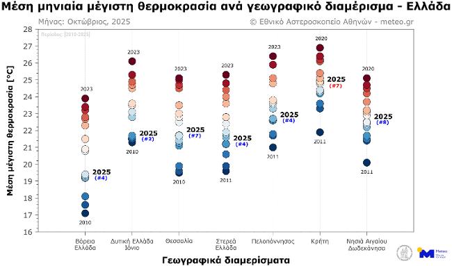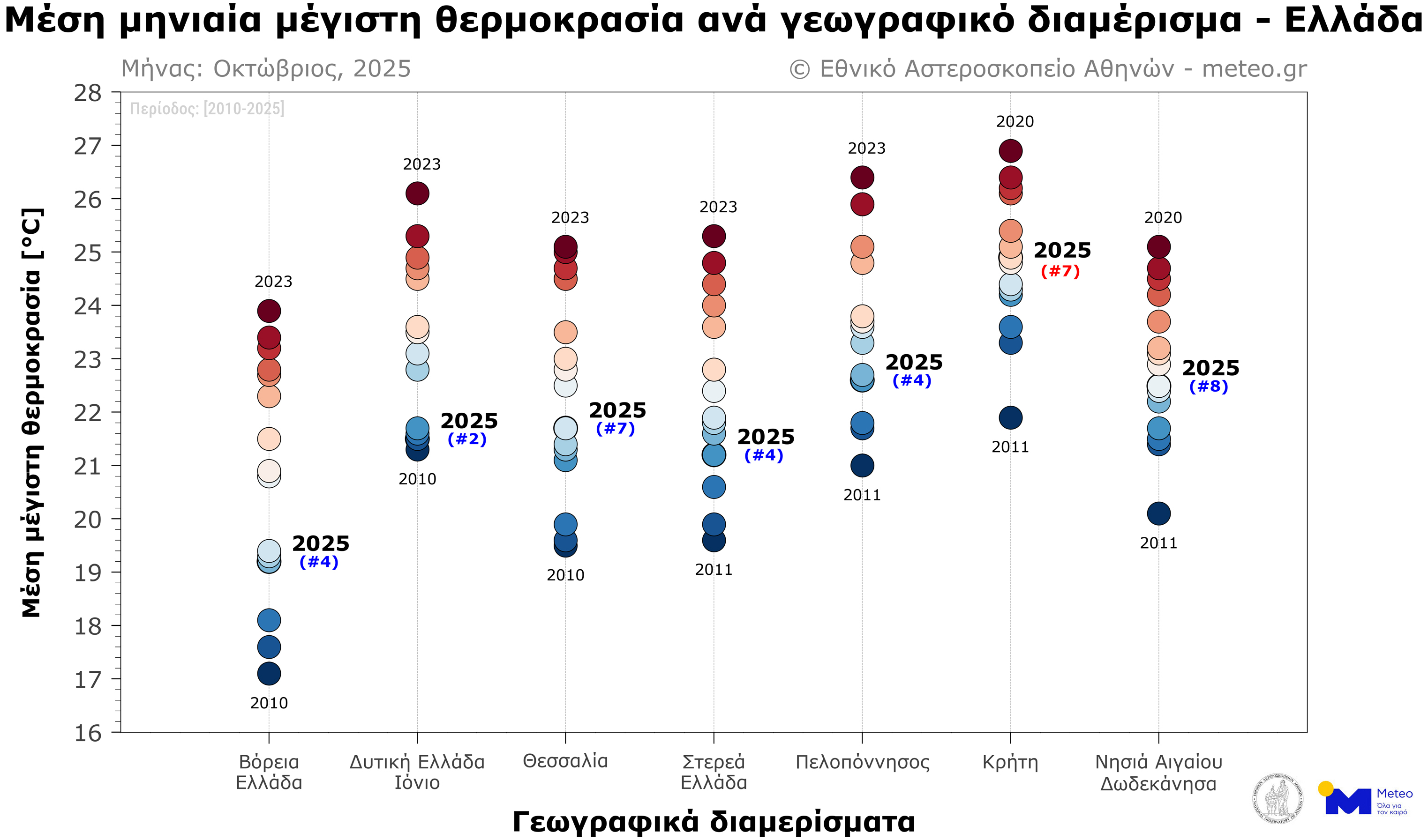 Το επόμενο γράφημα παρουσιάζει την κατάταξη του μήνα Οκτωβρίου ανά έτος, ανάλογα με τη μέση μηνιαία τιμή της μέγιστης θερμοκρασίας. Στη Δυτική Ελλάδα & Ιόνιο καταγράφηκε ως ο 2ος ψυχρότερος Οκτώβριος από το 2010, στη Βόρεια Ελλάδα, στη Στερεά Ελλάδα και στην Πελοπόννησο ως ο 4ος ψυχρότερος, στη Θεσσαλία ως ο 7ος ψυχρότερος, στα Νησιά του Αιγαίου και τα Δωδεκάνησα ως ο 8ος ψυχρότερος, ενώ στην Κρήτη καταγράφηκε ως ο 7ος θερμότερος των τελευταίων 15 ετών.