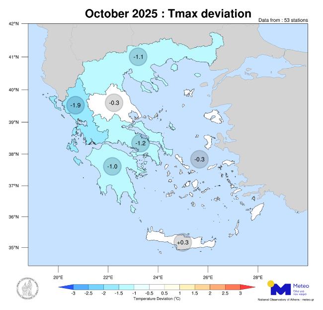 Σύμφωνα με το δίκτυο των 53 μετεωρολογικών σταθμών του meteo.gr του Εθνικού Αστεροσκοπείου Αθηνών (Ε.Α.Α) που λειτουργούν ανελλιπώς από το 2010 μέχρι σήμερα, τον Οκτώβριο του 2025 η μέση τιμή των μεγίστων ημερήσιων θερμοκρασιών κυμάνθηκε κάτω από τα κανονικά για την εποχή επίπεδα σε όλες τις περιοχές της χώρας εκτός από την Κρήτη (σε σχέση με τον μέσο όρο της περιόδου 2010-2019).