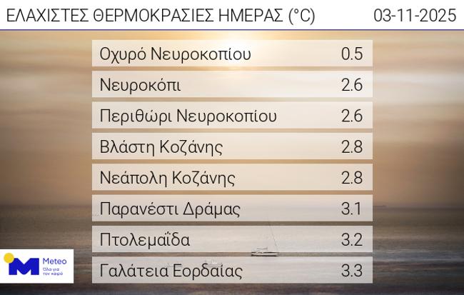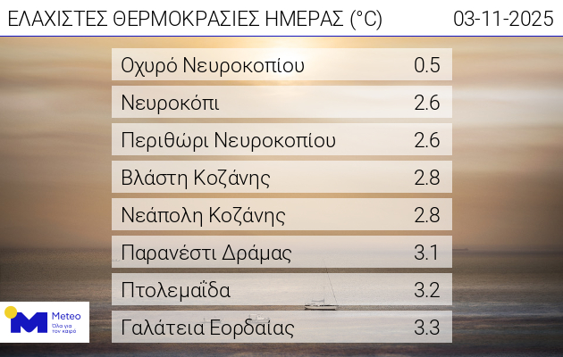 Τοπικά χαμηλές θερμοκρασίες σημειώθηκαν τις πρωινές ώρες της Δευτέρας 03/11 στα ηπειρωτικά. Η χαμηλότερη ελάχιστη θερμοκρασία καταγράφηκε στο μετεωρολογικό σταθμό στο Οχυρό Νευροκοπίου και ήταν ίση με 0.5˚C. Στον πίνακα που ακολουθεί παρουσιάζονται οι 8 σταθμοί με τις χαμηλότερες ελάχιστες θερμοκρασίες μεταξύ των σταθμών του δικτύου του meteo.gr / Εθνικού Αστεροσκοπείου Αθηνών.