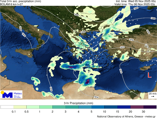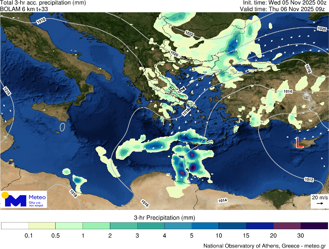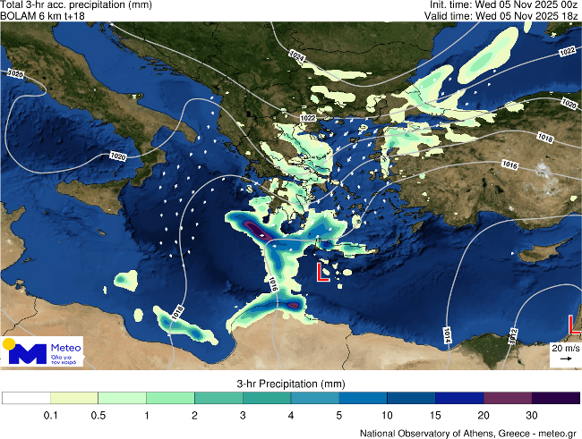 Στην παρακάτω ομάδα χαρτών παρουσιάζεται ο εκτιμώμενος αθροιστικός υετός 3ώρου μεταξύ 17:00-20:00 της Τετάρτης 05/11, 02:00-05:00 και 08:00-11:00 της Πέμπτης 06/11.