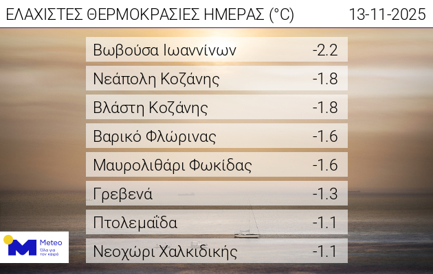 Σε ελαφρώς χαμηλότερα, για την εποχή, επίπεδα ήταν οι ελάχιστες τιμές θερμοκρασίας στη χώρα μας το πρωί της Πέμπτης 13/11. Σε μεγάλο μέρος της ηπειρωτικής χώρας καταγράφηκαν μονοψήφιες τιμές θερμοκρασίας, ενώ σε αρκετές περιοχές της Μακεδονίας και της Ηπείρου σημειώθηκε και παγετός. Η χαμηλότερη να καταγράφηκε στον μετεωρολογικό σταθμό της Βωβούσας και ήταν ίση με -2.2˚C. Στον πίνακα που ακολουθεί παρουσιάζονται οι 8 σταθμοί με τις χαμηλότερες τιμές θερμοκρασίας μεταξύ των σταθμών του δικτύου του meteo.gr / Εθνικού Αστεροσκοπείου Αθηνών.