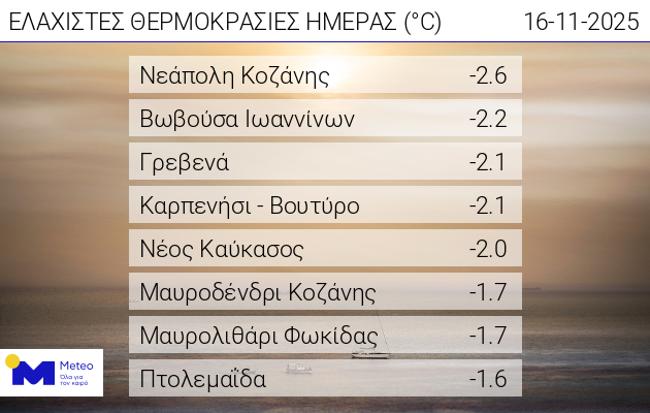 Παγετός σημειώθηκε τις πρωινές ώρες της Κυριακής 16/11 κυρίως στα βόρεια και κεντρικά ηπειρωτικά τμήματα, με τη χαμηλότερη ελάχιστη θερμοκρασία να καταγράφεται στη Νεάπολη Κοζάνης με -2,6 °C. Σύμφωνα με το δίκτυο αυτόματων μετεωρολογικών σταθμών του Εθνικού Αστεροσκοπείου Αθηνών / meteo.gr οι οκτώ χαμηλότερες ελάχιστες θερμοκρασίες τις πρωινές ώρες της Κυριακής 16/11, παρουσιάζονται στον παρακάτω Πίνακα.