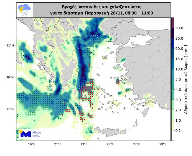 Σύμφωνα με τα προγνωστικά στοιχεία του meteo.gr / EAA, την Παρασκευή 28/11 η κακοκαιρία θα συνεχιστεί με ισχυρές βροχές και καταιγίδες, μεγάλα ύψη βροχής κατά τόπους, αλλά και χαλαζοπτώσεις με πιθανότητα για χαλάζι μεγάλου μεγέθους.