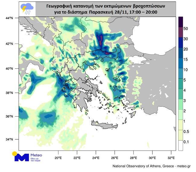 Την Παρασκευή 28/11, αναμένονται τοπικά ισχυρές βροχές και καταιγίδες, στη Δυτική Ελλάδα, στη Στερεά, στην Πελοπόννησο, στην Κεντρική και Ανατολική Μακεδονία, στη Θράκη και σε περιοχές της Θεσσαλίας και των Σποράδων. Ανάλογα φαινόμενα θα επηρεάσουν από τις μεσημεριανές ώρες τα νησιά του Βόρειου και Ανατολικού Αιγαίου και τις Κυκλάδες και προς το βράδυ τα Δωδεκάνησα και την Κρήτη. Χαλαζοπτώσεις θα εκδηλωθούν κυρίως στην Πελοπόννησο, στην Ανατολική Στερεά, συμπεριλαμβανομένης της Αττικής, και προοδευτικά στα νησιά του Αιγαίου. Κατά τόπους το χαλάζι ενδέχεται να είναι μεγάλου μεγέθους. Χιόνια θα πέσουν στα δυτικά, κεντρικά και βόρεια ορεινά.