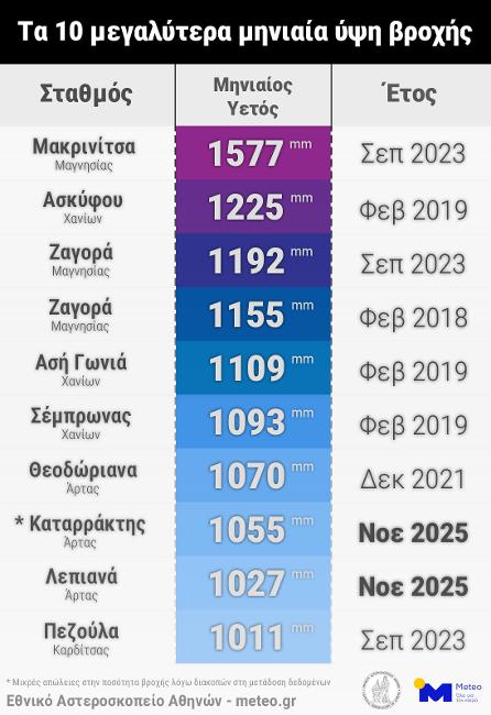 Εικόνα 2. Τα 10 μεγαλύτερα μηνιαία ύψη βροχής από το δίκτυο αυτόματων μετεωρολογικών σταθμών του meteo.gr / Εθνικού Αστεροσκοπείου Αθηνών.