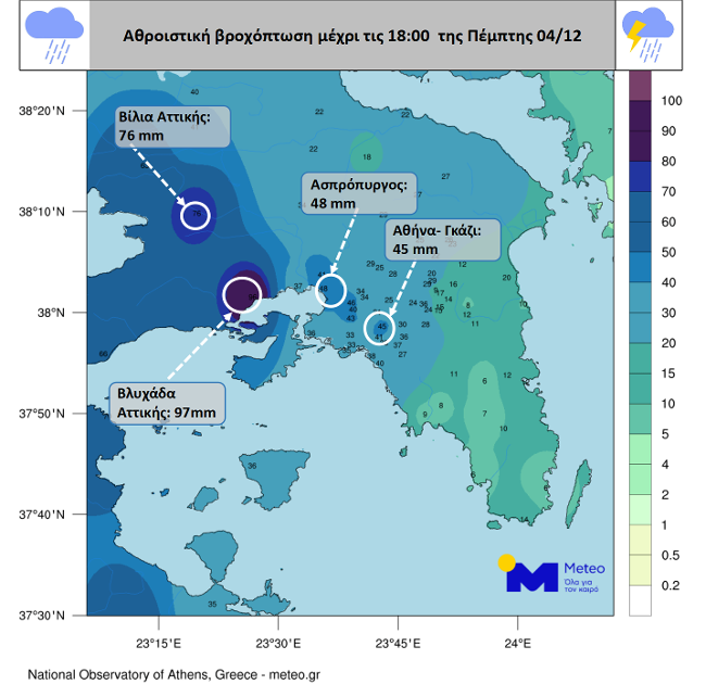 Σε συμφωνία με τα προγνωστικά στοιχεία των προηγούμενων ημερών, σημαντικές βροχοπτώσεις εκδηλώνονται στο νομό Αττικής αλλά και στην πόλη της Αθήνας από το μεσημέρι της Πέμπτης 04/12. Στο χάρτη που ακολουθεί αποτυπώνονται τα αθροιστικά ύψη βροχόπτωσης έως τις 18:00 το απόγευμα, όπως αυτά καταγράφηκαν από 101 μετεωρολογικούς σταθμούς του δικτύου αυτόματων μετεωρολογικών σταθμών του Εθνικού Αστεροσκοπείου Αθηνών / meteo.gr.