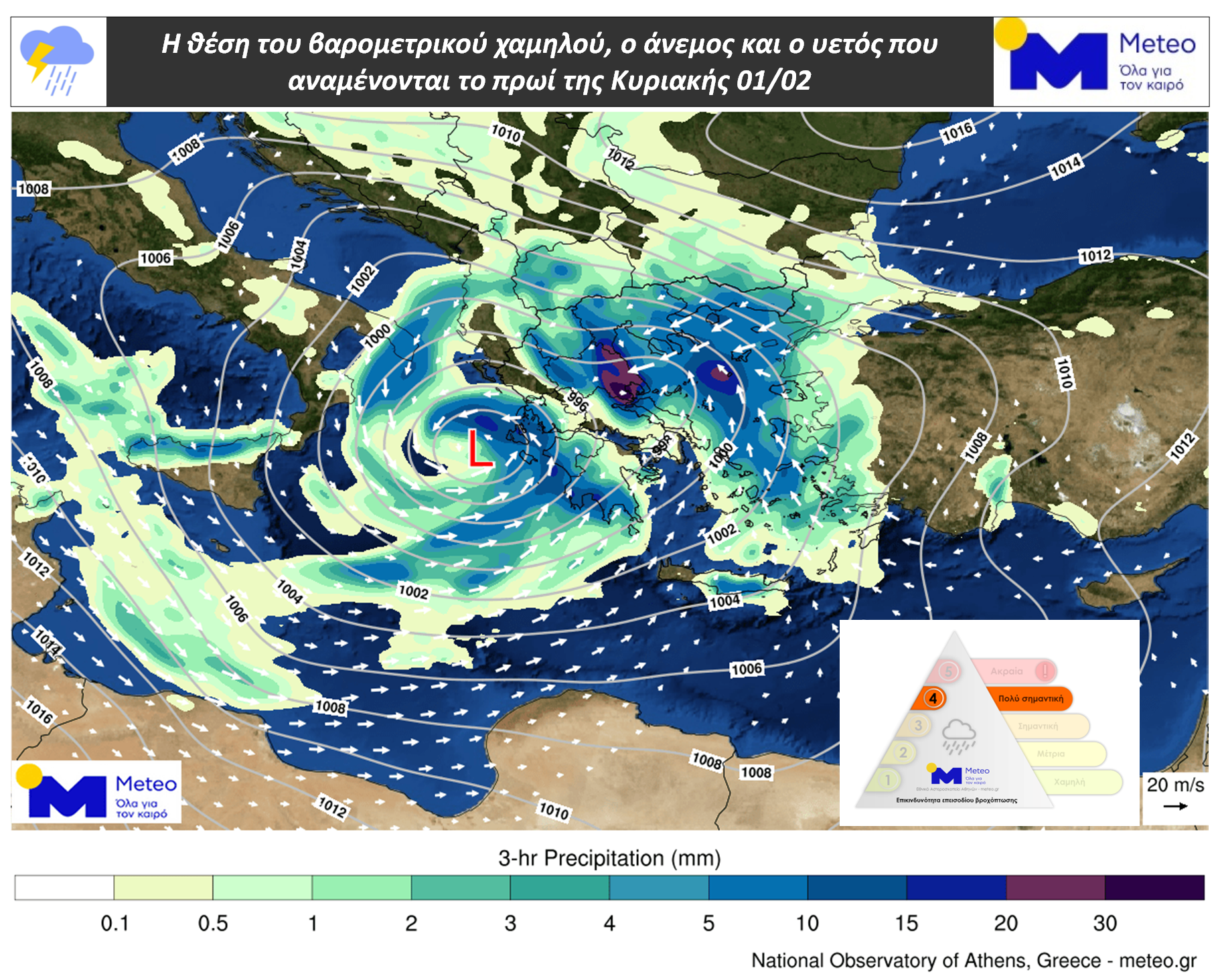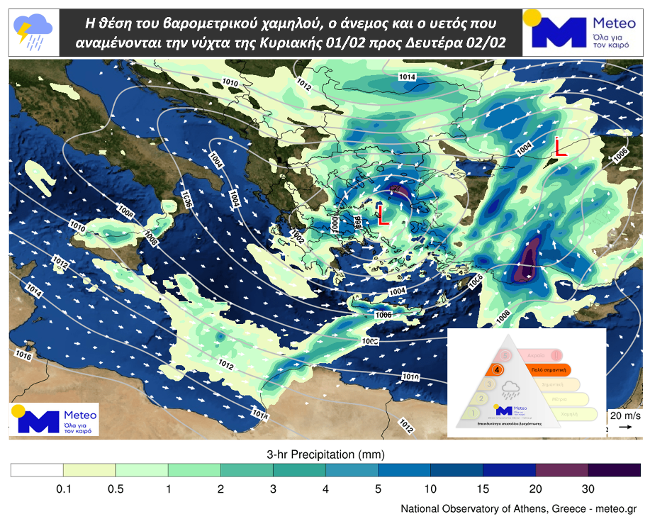 Στους χάρτες των εικόνων 1 έως 3 παρουσιάζεται η θέση του βαρομετρικού χαμηλού, ο άνεμος κοντά στο έδαφος και η βροχόπτωση που αναμένονται (1) τις πρώτες ώρες της Κυριακής 01/02, (2) το πρωί της Κυριακής 01/02 και (3) τη νύχτα της Κυριακής 01/02 προς Δευτέρα 02/02.