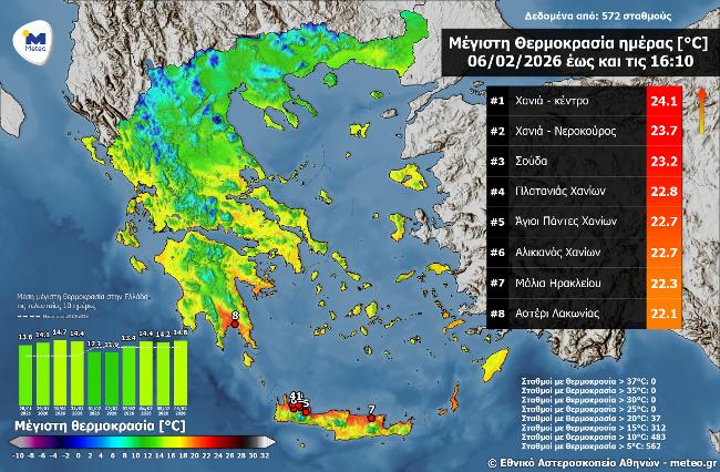 Υψηλές μέγιστες θερμοκρασίες σημειώθηκαν στη χώρα την Παρασκευή 06/02, με τις μέγιστες τιμές να φτάνουν στους 22-24°C. Σύμφωνα με το δίκτυο αυτόματων μετεωρολογικών σταθμών του Εθνικού Αστεροσκοπείου Αθηνών / meteo.gr, η υψηλότερη μέγιστη θερμοκρασία καταγράφηκε στο κέντρο της πόλης των Χανίων με 24,1 °C.