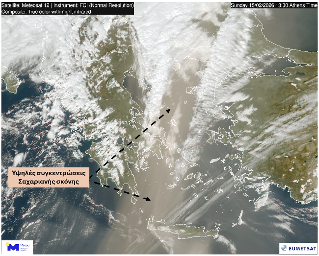 Υψηλές συγκεντρώσεις Σαχαριανής σκόνης καταγράφονται σε μεγάλο μέρος της χώρας το μεσημέρι της Κυριακής 15/02 όπως διακρίνεται και από τη δορυφορική εικόνα του Ευρωπαïκού δορυφόρου MTG της EUMETSAT.