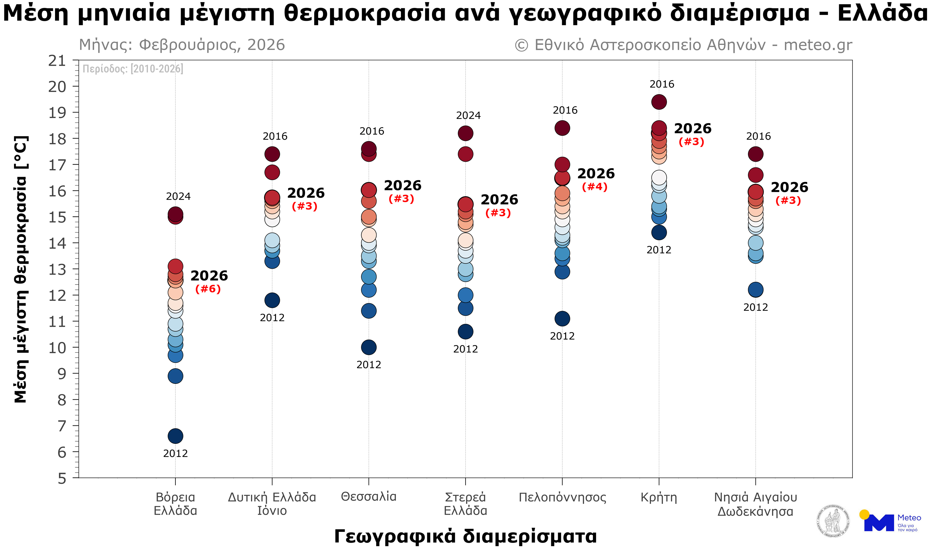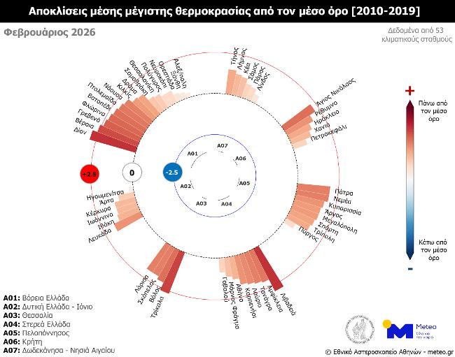 Σύμφωνα με το δίκτυο των 53 μετεωρολογικών σταθμών του meteo.gr του Εθνικού Αστεροσκοπείου Αθηνών (Ε.Α.Α.), που λειτουργούν ανελλιπώς από το 2010 έως σήμερα, τον Φεβρουάριο του 2026 η μέση τιμή των μεγίστων ημερήσιων θερμοκρασιών κυμάνθηκε σε υψηλότερα για την εποχή επίπεδα (σε σύγκριση με τον μέσο όρο της περιόδου 2010–2019) σε όλα τα γεωγραφικά διαμερίσματα.