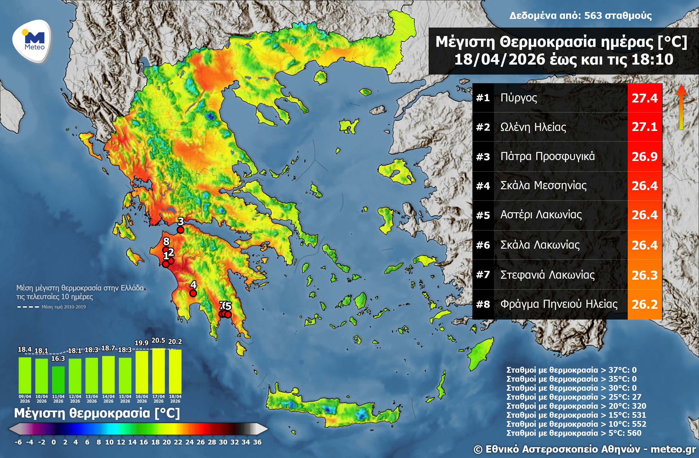Υψηλές θερμοκρασίες επικράτησαν στη Δυτική και Νότια Πελοπόννησο τις μεσημεριανές ώρες του Σαββάτου 18/04, με τις μέγιστες τιμές να ξεπερνούν τους 27 °C. Σύμφωνα με το δίκτυο αυτόματων μετεωρολογικών σταθμών του Εθνικού Αστεροσκοπείου Αθηνών / meteo.gr, η υψηλότερη μέγιστη θερμοκρασία καταγράφηκε στoν Πύργο με 27,4 °C.