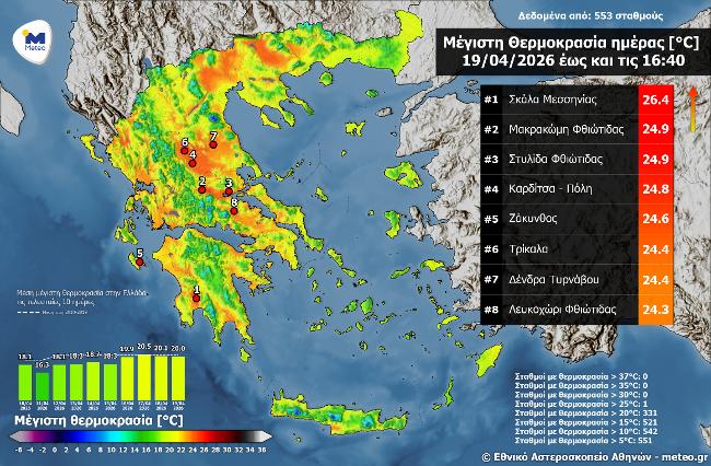 Σχετικά υψηλές θερμοκρασίες επικράτησαν τις μεσημεριανές ώρες της Κυριακής 19/04, με τις υψηλότερες τιμές να σημειώνονται στη Μεσσηνία, στη Θεσσαλία και στη Ζάκυνθο. Σύμφωνα με το δίκτυο αυτόματων μετεωρολογικών σταθμών του Εθνικού Αστεροσκοπείου Αθηνών / meteo.gr, η υψηλότερη μέγιστη θερμοκρασία καταγράφηκε στη Σκάλα Μεσσηνίας με 26,4 °C.