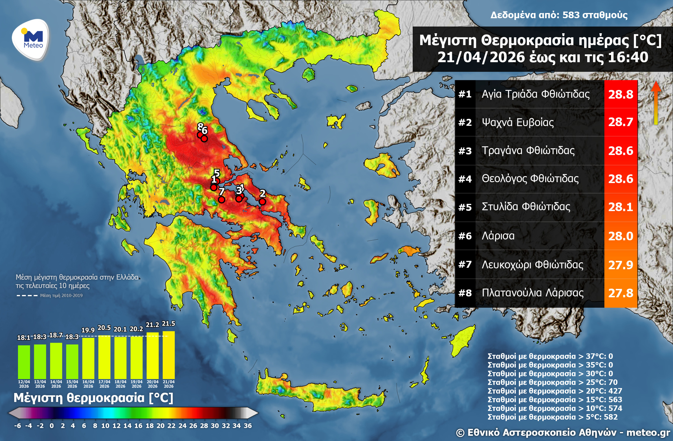 Οι νεφώσεις που κατά διαστήματα ήταν πυκνές στα βόρεια και δυτικά τμήματα της χώρας καθώς και τα τοπικά φαινόμενα που εκδηλωθήκαν έως το μεσημέρι συγκράτησαν τις μέγιστες θερμοκρασίες της Τρίτης 21/04 στις παραπάνω περιοχές. Όμως στα υπόλοιπά ηπειρωτικά όπου οι νεφώσεις ήταν λιγότερες καταγράφηκαν σχετικά υψηλές θερμοκρασίες με τις μέγιστες τιμές να σημειώνονται στη Ανατολική Στερεά Ελλάδα και στη Θεσσαλία. Η απολύτως μέγιστη καταγράφηκε στην Αγία Τριάδα Φθιώτιδας και ήταν ίση με 28.8 °C. Στον χάρτη της εικόνας που ακολουθεί παρουσιάζεται η κατανομή της μέγιστης θερμοκρασίας στη χώρα σύμφωνα με το δίκτυο αυτόματων μετεωρολογικών σταθμών του Εθνικού Αστεροσκοπείου Αθηνών / meteo.gr.