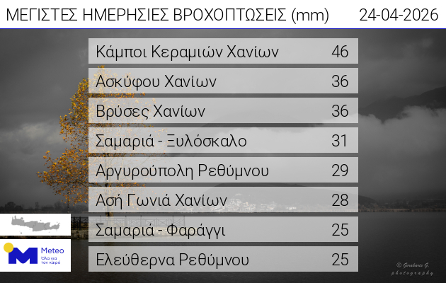 Σημαντικές βροχές σημειώθηκαν στην Κρήτη την Παρασκευή 24/04. Το μεγαλύτερο ύψος βροχής έως τις 16:30 καταγράφηκε στους Κάμπους Καραμιών Χανίων και ήταν ίσο με 46 χιλιοστά. Στον σχετικό πίνακα παρουσιάζονται οι 8 σταθμοί του δικτύου αυτόματων μετεωρολογικών σταθμών του Εθνικού Αστεροσκοπείου Αθηνών / meteo.gr που κατέγραψαν τα μεγαλύτερα ύψη βροχής στην Κρήτη έως τις 16:30 της Παρασκευής 24/04.