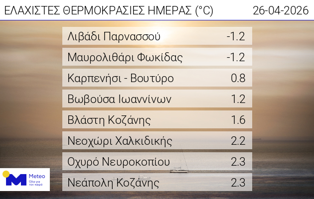 Χαμηλές θερμοκρασίες σημειώθηκαν στα ορεινά της χώρας το πρωί της Κυριακής 26/04 με το θερμόμετρο σε κάποιες περιπτώσεις να πέφτει κάτω από τους 0 °C. Στον σχετικό πίνακα παρουσιάζονται οι 8 σταθμοί του δικτύου αυτόματων μετεωρολογικών σταθμών του Εθνικού Αστεροσκοπείου Αθηνών / meteo.gr που κατέγραψαν τις χαμηλότερες θερμοκρασίες. Στον πίνακα δεν παραλαμβάνονται σταθμοί που λειτουργούν σε ορεινά καταφύγια και χιονοδρομικά κέντρα.