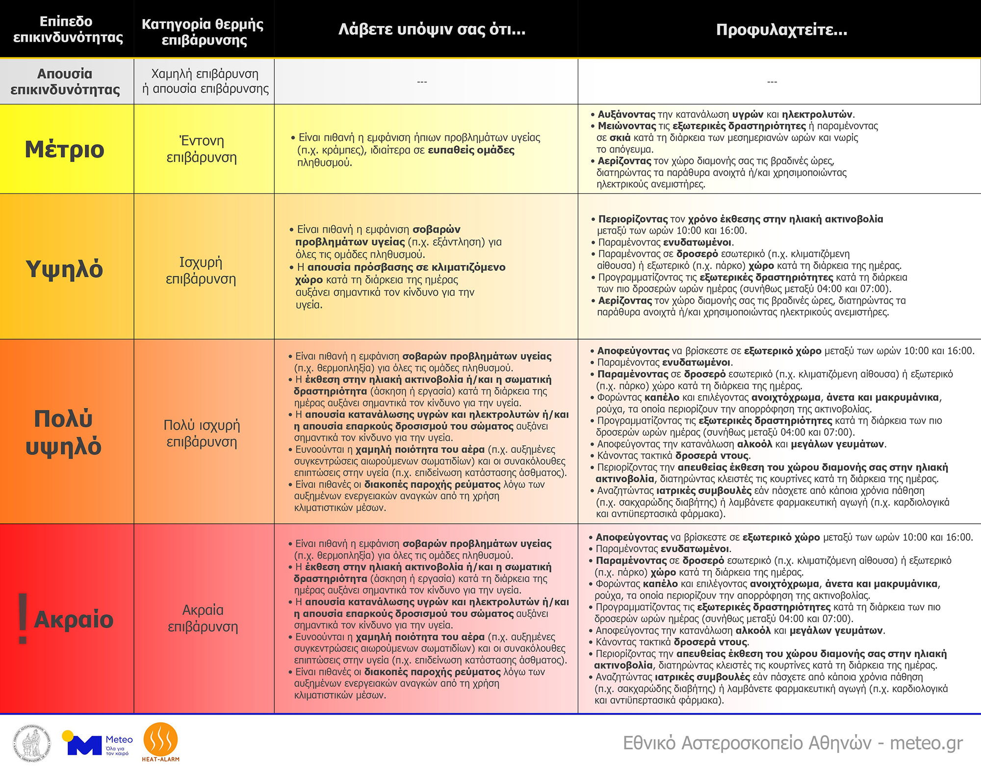 Η επιβάρυνση που προκαλείται στον ανθρώπινο οργανισμό λόγω της επίδρασης θερμών περιβαλλοντικών συνθηκών ή/και αυξημένης μεταβολικής δραστηριότητας (π.χ. εργασία σε χωράφι) αποτελεί σημαντική απειλή για την ανθρώπινη υγεία. Για αυτό, για πρώτη φορά στην Ελλάδα, στο πλαίσιο του ερευνητικού έργου HEAT-ALARM, εκδίδονται προειδοποιήσεις σε κάθε περιφερειακή ενότητα της χώρας για ημέρες κατά τις οποίες το θερμή επιβάρυνση μπορεί να οδηγήσει σε σοβαρά προβλήματα υγείας (π.χ. θερμική εξάντληση) ή ακόμα και στον θάνατο (θερμοπληξία). Υπάρχουν τέσσερα επίπεδα προειδοποίησης, κάθε ένα από τα οποία αξιολογεί τον βαθμό και την επικινδυνότητα της θερμής επιβάρυνσης, λαμβάνοντας υπόψη μετεωρολογικές παραμέτρους (θερμοκρασία, υγρασία, άνεμος, ακτινοβολία), αλλά και τα χαρακτηριστικά (φύλο, ηλικία, βάρος, ύψος), το επίπεδο ένδυσης και τη σωματική δραστηριότητα μέσων ανθρώπων διαφορετικών πληθυσμιακών ομάδων. Σε αυτές τις ομάδες συμπεριλαμβάνονται γυναίκες, ηλικιωμένοι/ες και εργαζόμενοι/ες σε εξωτερικούς χώρους, οι οποίοι/ες ανήκουν στις περισσότερο ευάλωτες κατηγορίες πληθυσμού. Περισσότερες πληροφορίες σχετικά με τα κριτήρια έκδοσης προειδοποίησης, αλλά και συνολικά για το βιομετεωρολογικό σύστημα προειδοποίησης HEAT-ALARM, μπορούν να βρεθούν εδώ.